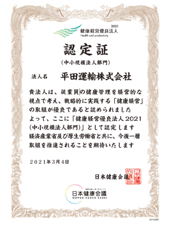 【兵庫県加西市の運送会社☺平田運輸のブログ】健康経営優良法人2021(中小規模法人部門)に認定されました!