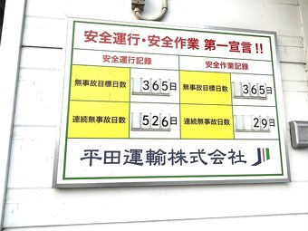 仕事中は「平田運輸」の大きな看板を背負っているので、